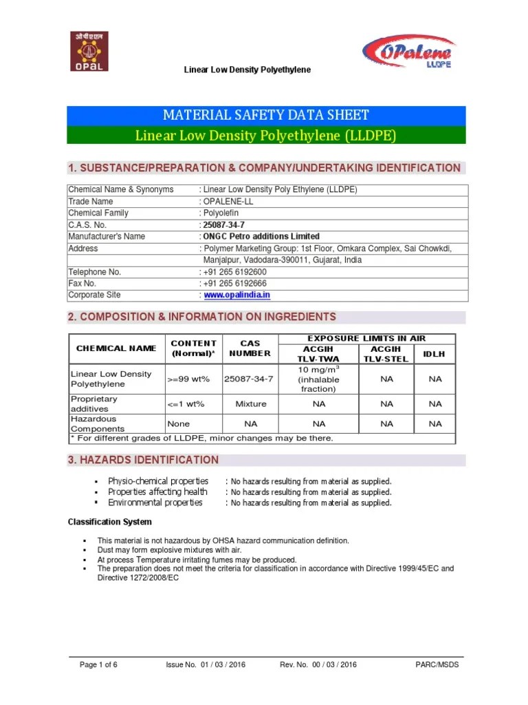 Material Safety Data Sheet LLDPE PDF PDF Toxicity Fires
